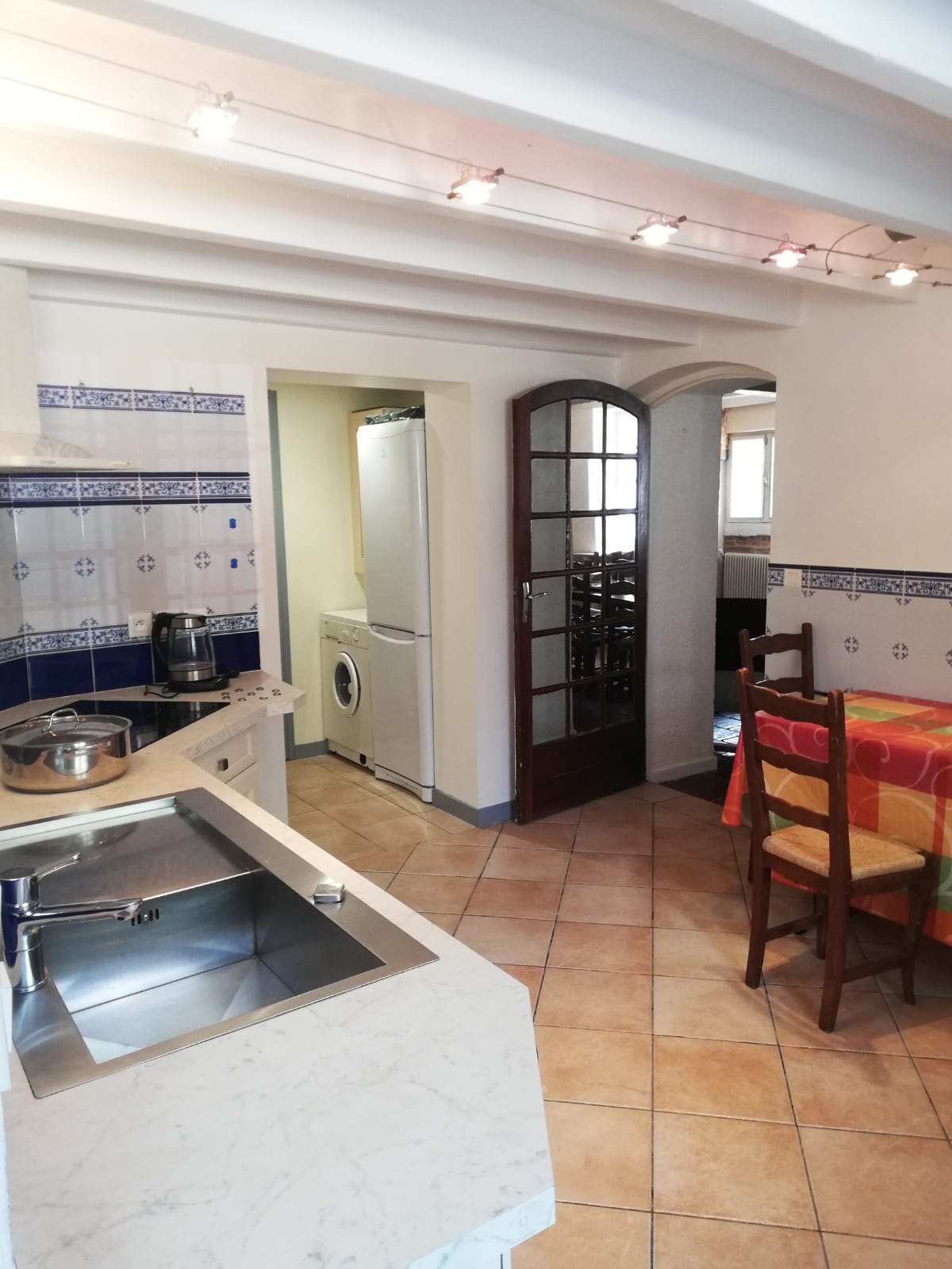 Au rez-de-chaussée : cuisine équipée, WC, salle à manger avec cheminée et coin salon.