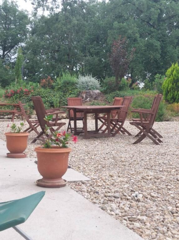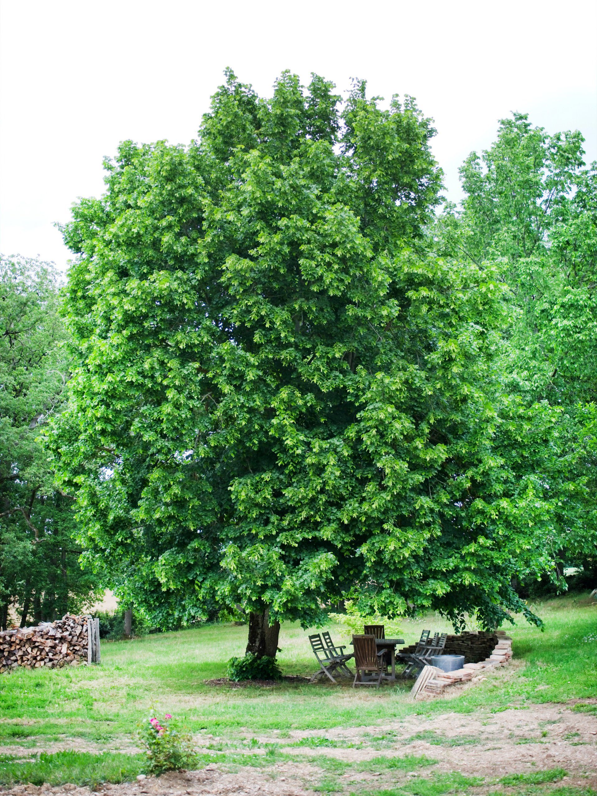 La grande table installée à l'ombre du tilleul peut accueillir jusqu'à 12 personnes.